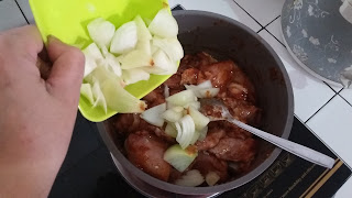 - Masukan potongan ayam yang telah dicuci. Aduk hingga tercampur dengan bumbu. Tambahkan bawang bombai, jahe dan segelas air. Aduk. Tutup panci, masak dengan api sedang selama 20 menit.